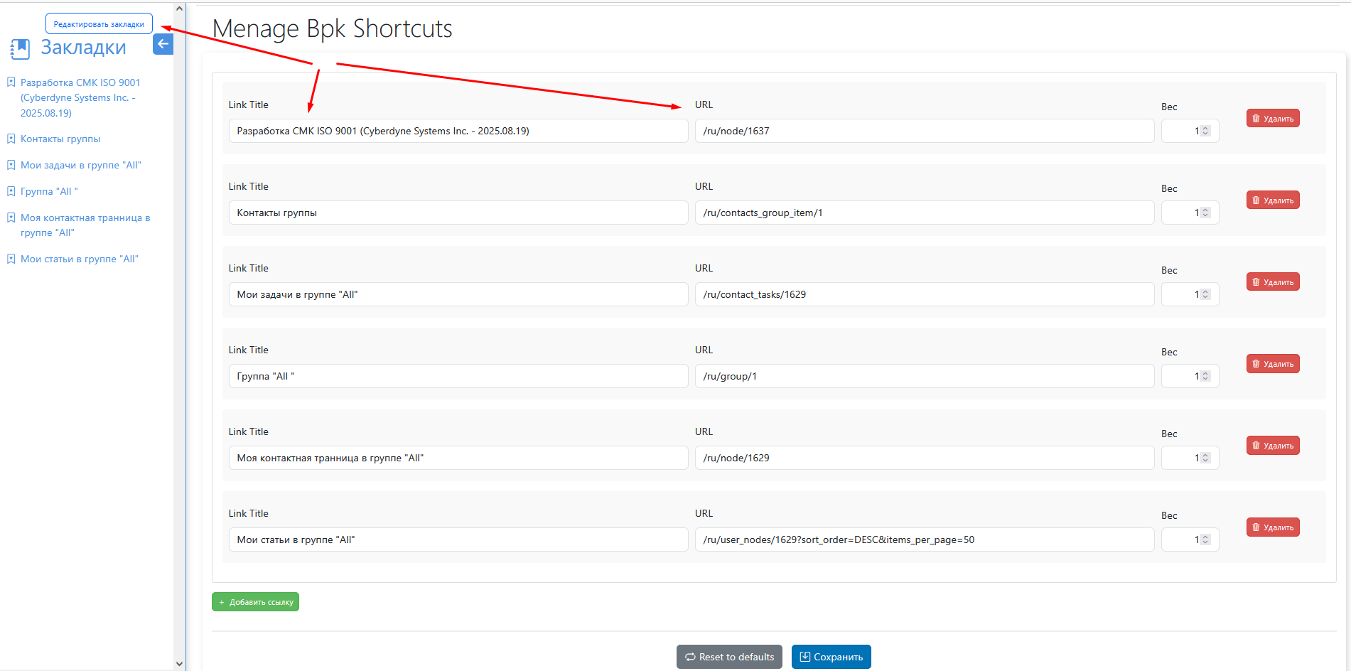 При необходимости легко настроить индивидуальные или групповые подборки для задач по проекту либо тематическим разделам.​ Для этого необходимо кликнуть на кнопку "Редактировать вкладки". На открывшейся странице редактирования можно изменить заголовки ссылок и поменять их расположение в панели вкладок, изменив значение поля "Вес" .