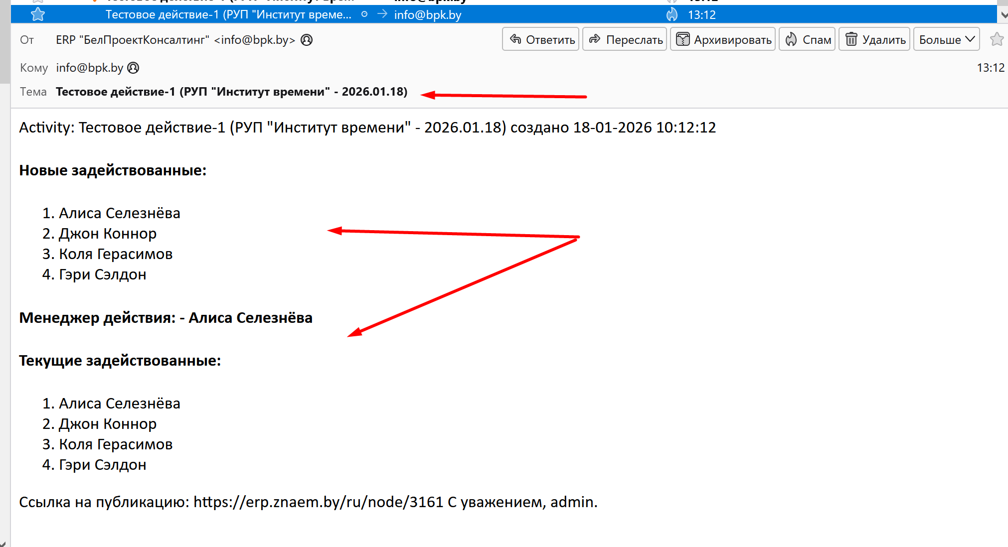 ERP.Znaem.by предоставляет систему email-уведомлений для повышения командной информированности в действиях, задачах, проектах и других типах контента. Уведомления автоматически отправляются всем задействованным пользователям при ключевых изменениях, исключая необходимость ручной пересылки информации. Функционал охватывает добавление/удаление файлов, обновления материалов, добавление и удаление комментариев.