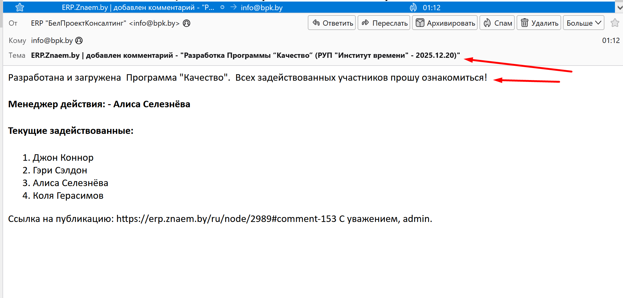ERP.Znaem.by предоставляет систему email-уведомлений для повышения командной информированности в действиях, задачах, проектах и других типах контента. Уведомления автоматически отправляются всем задействованным пользователям при ключевых изменениях, исключая необходимость ручной пересылки информации. Функционал охватывает добавление/удаление файлов, обновления материалов, добавление и удаление комментариев.